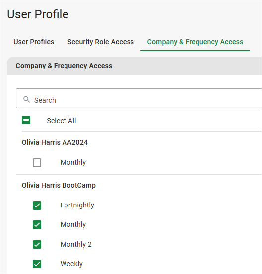 Navigate > Config > Security > Security > User Profiles > Company & Frequency Access