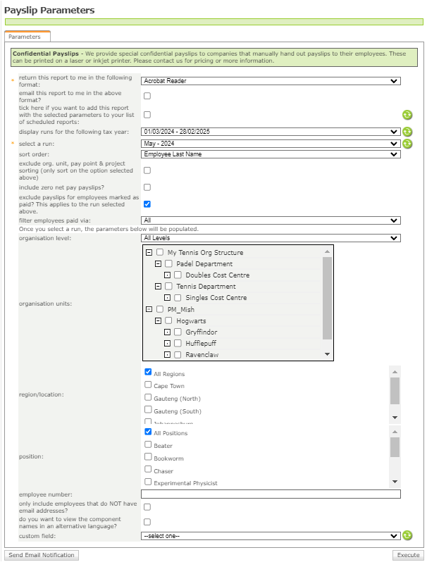 If Employee Self Service (ESS) is used, selecting this option will e-mail payslip notifications to employees. The e-mail will contain a link that will direct the employee to their Employee Self Service (ESS) profile.