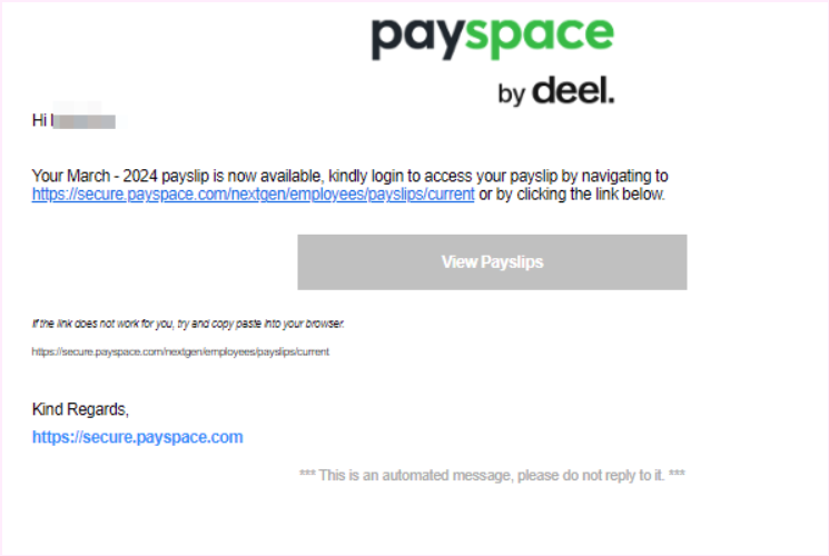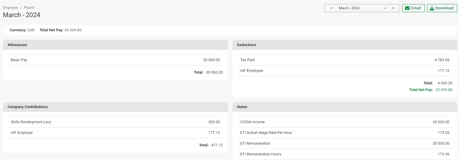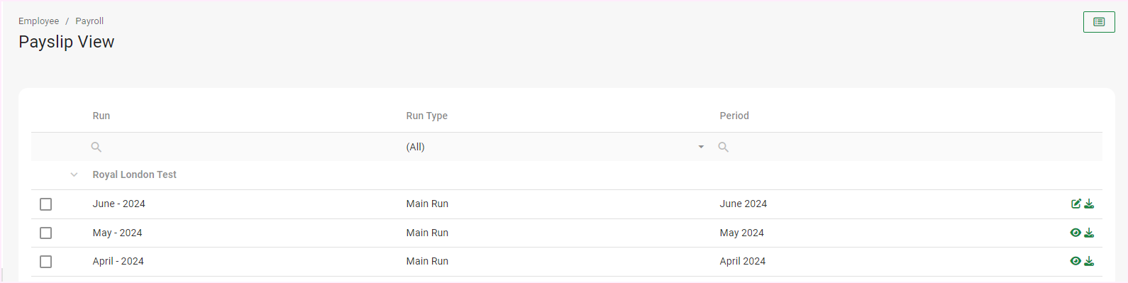 Once the employee accesses their ESS profile via the "View payslips" button on the email, they will be able to view and download their payslip from the Payslips screen.