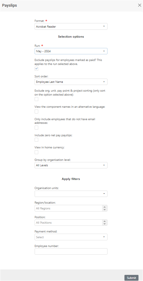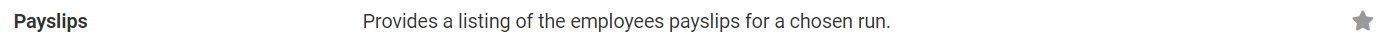 The Payslips Report can be generated for employees who are paid Cash, Cheque or EFT.