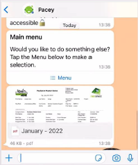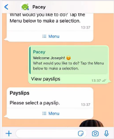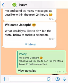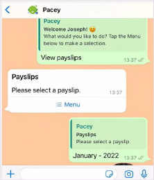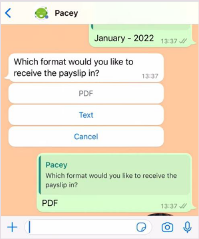 Pacey allows employees to view and download their payslips through Whatsapp in PDF or text format.