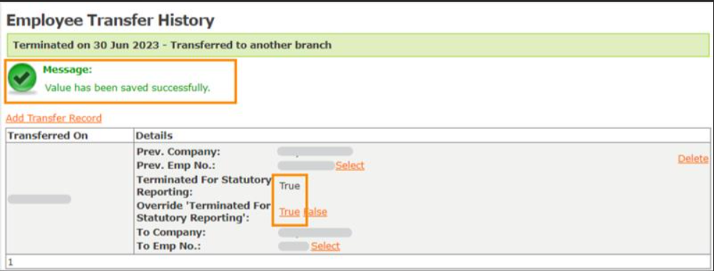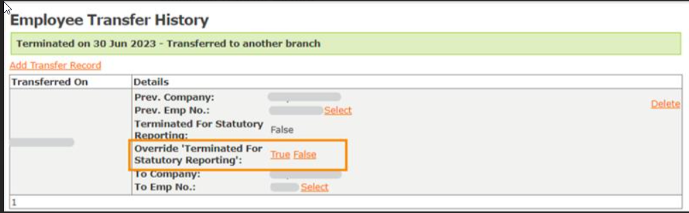 The details pertaining to the transfer are shown on this screen, with a field named Override ‘Terminated For Statutory Reporting’. There are two selections on the right of this field, shown as True False.