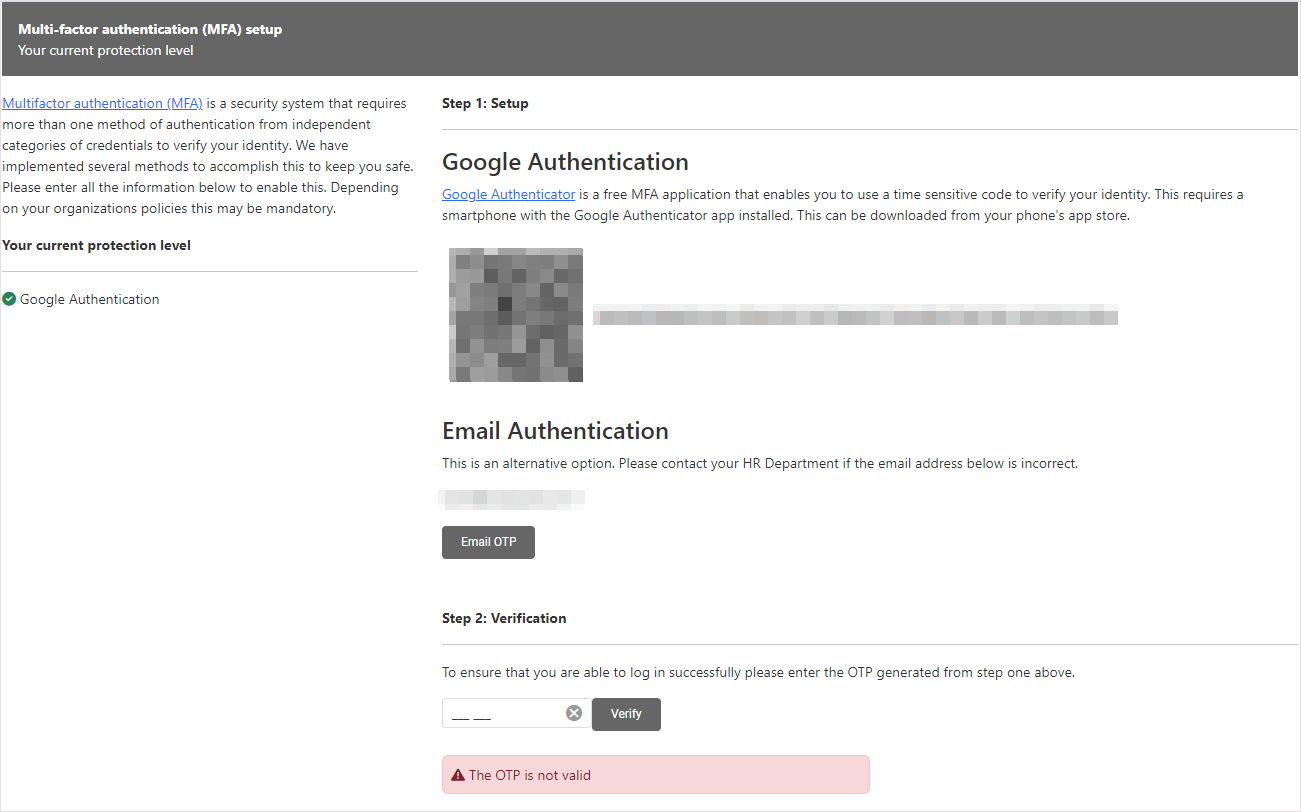 The employee will first need to log in to their profile, to request the Authentication code be sent by either email or SMS.
