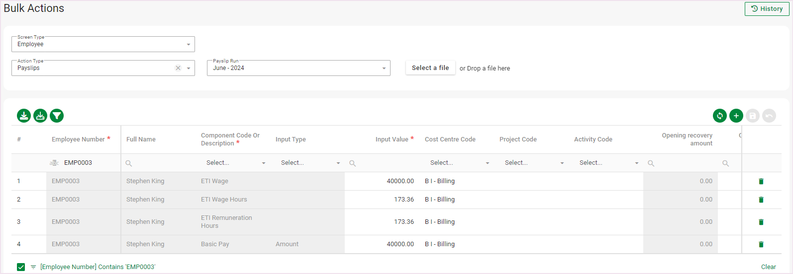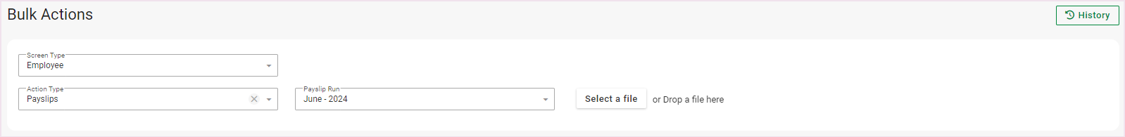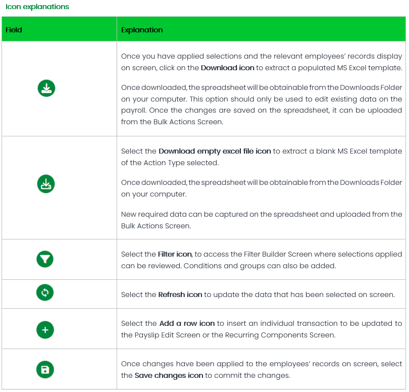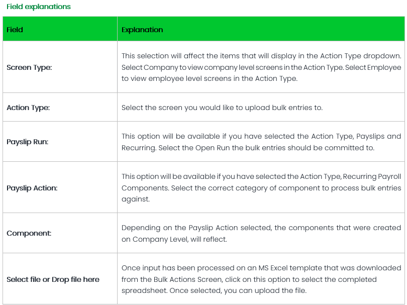 In addition to processing payroll data for individual employee records, payroll information can also be managed through the Bulk Actions Screen. Bulk entries can be uploaded to either the Payslip Edit Screen or the Recurring Components Screen. Templates for updating information on other selected screens are also available.
