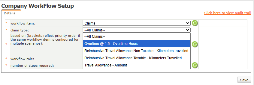 Overview The Workflow Configuration Screen allows you to create rules for workflow items to move through a defined number of approval steps. Workflows can be setup for Claims, Commissions, Employee Request and/or Leave. Edition This feature is ...