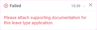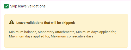 The "skip leave validations" field may be enabled on company level when a leave application is processed by a company level user, in order to submit a leave application without an attachment.