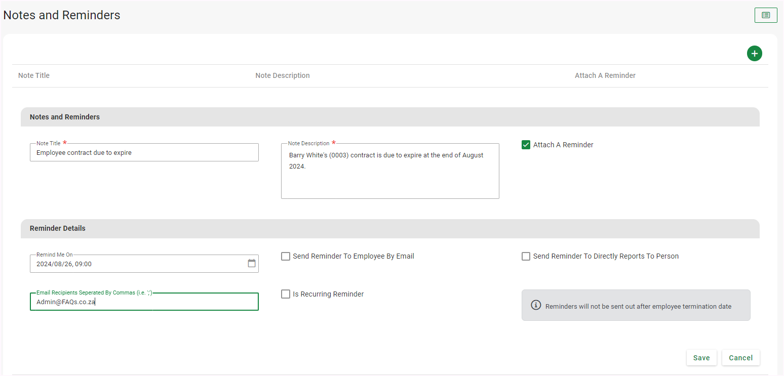 Can I configure a reminder to be sent out to remind the company administrator when an employee's contract expires?