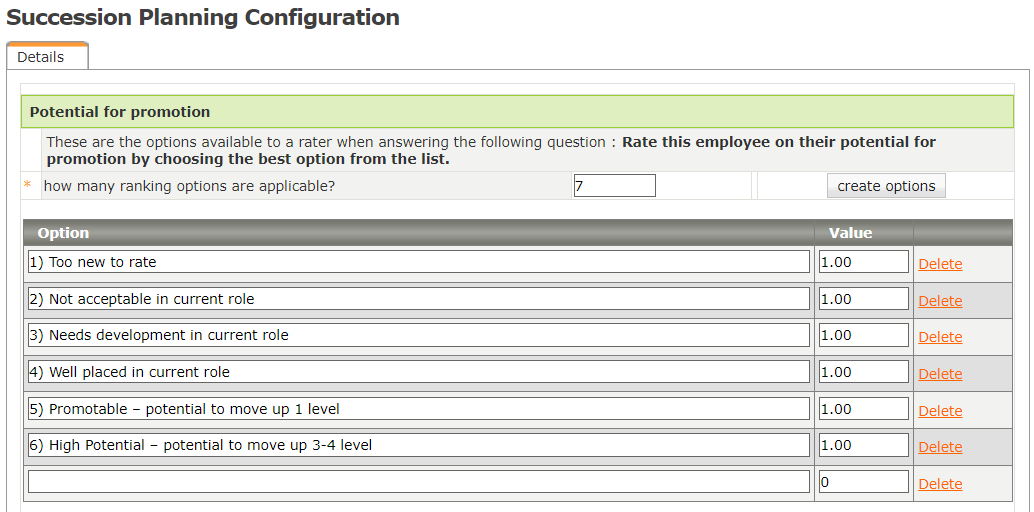 Custom questions can be created for the Success Management section of a template, by specifying a number greater in the "how many ranking options are applicable?" field on the Succession Planning Configuration screen.