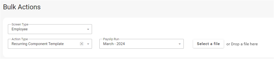 Overview In addition to processing payroll data for individual employee records, payroll information can also be managed through the Bulk Actions Screen. Bulk entries can be uploaded to either the Payslip Edit Screen or the Recurring Components ...