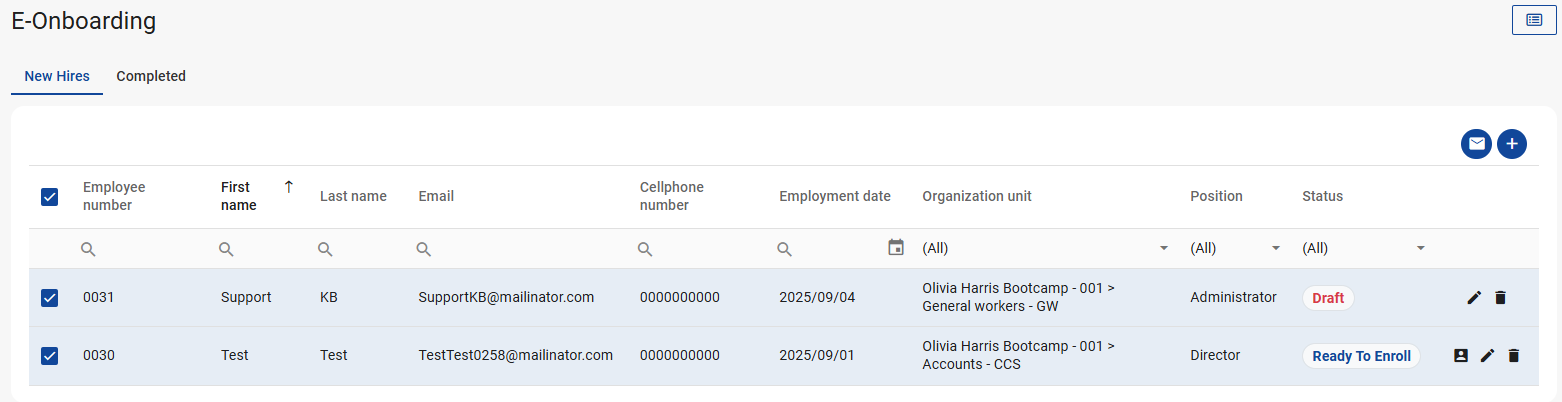 Yes. You can register multiple new hires on the E-Onboarding screen and then use the multi-select function to choose the applicable records. Simply click the email icon to send out all welcome emails simultaneously.