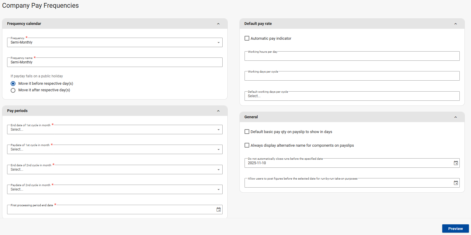 Runs will be created from the start date specified when creating a new frequency. Once the frequency has been configured, the company may require backdated and/or future runs to be created. Due to the sensitive nature of the Pay Frequencies screen, ...
