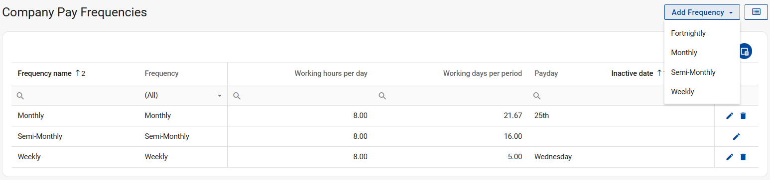 A new frequency (Fortnightly, Monthly or Weekly) can be created on the Pay Frequencies screen by clicking on the "Add Frequency" dropdown button and selecting the type of frequency required. Navigate > Configuration > Payroll > Payroll Config > Pay ...