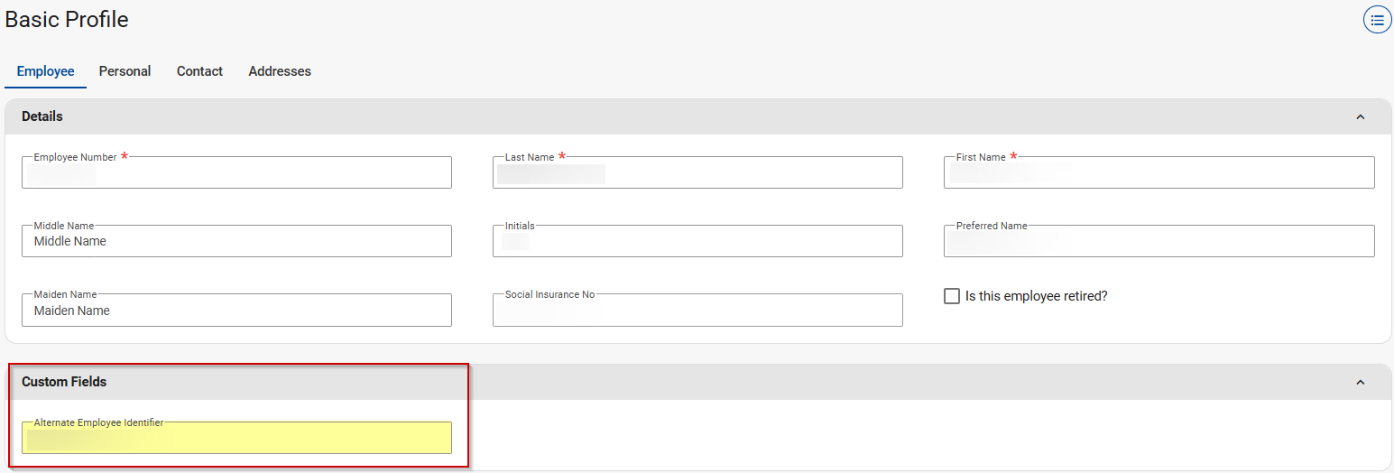 Custom fields can be added to the employee Basic Profile screen to allow the capturing of custom/alternate employee numbers.