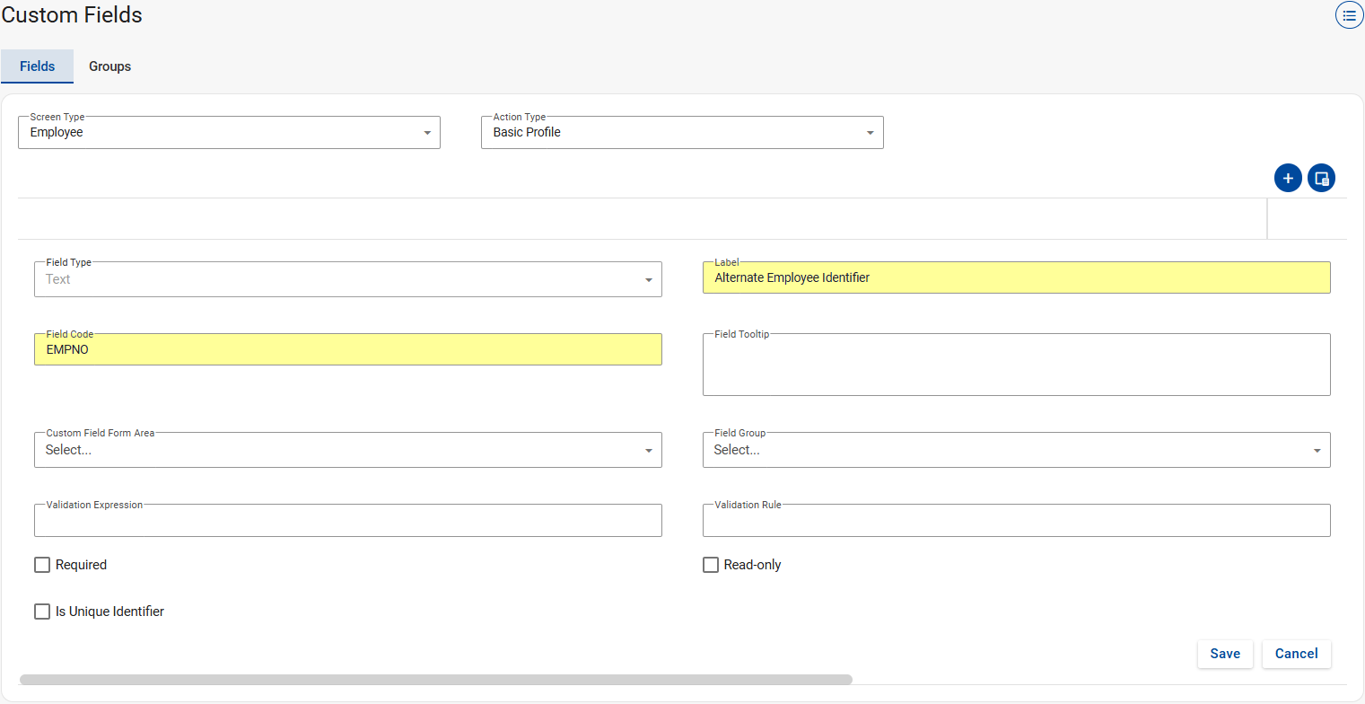 To link the custom field to the employee's Basic Profile, select the appropriate field types as Screen Type: Employee and Action Type: Basic Profile.
