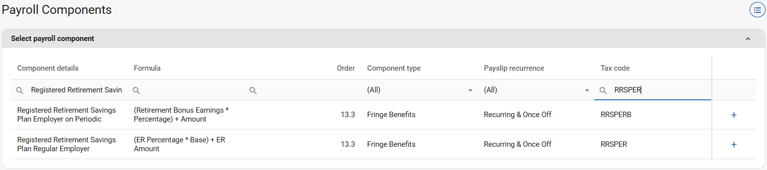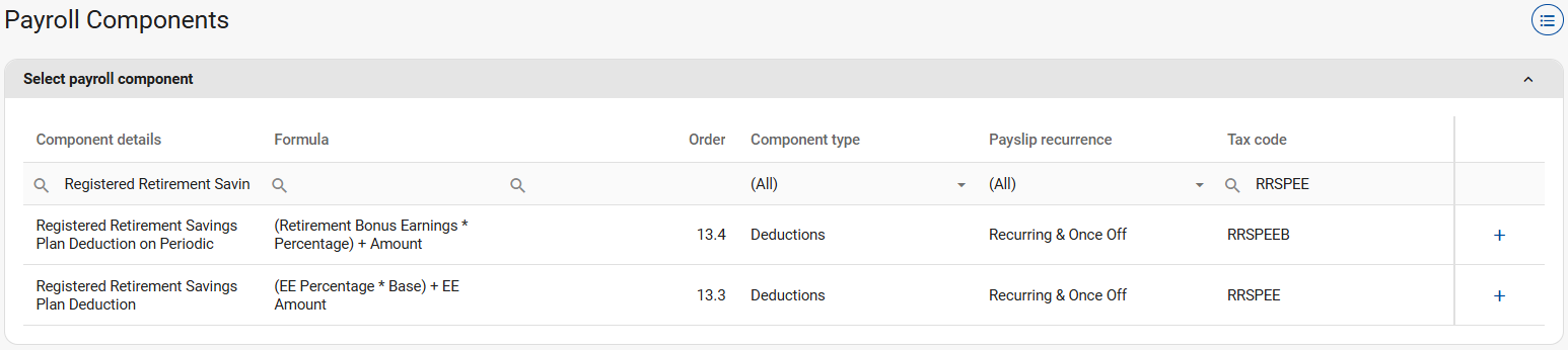 Step 1: Search for the employee deduction or fringe benefit Registered Retirement Savings Plan components.