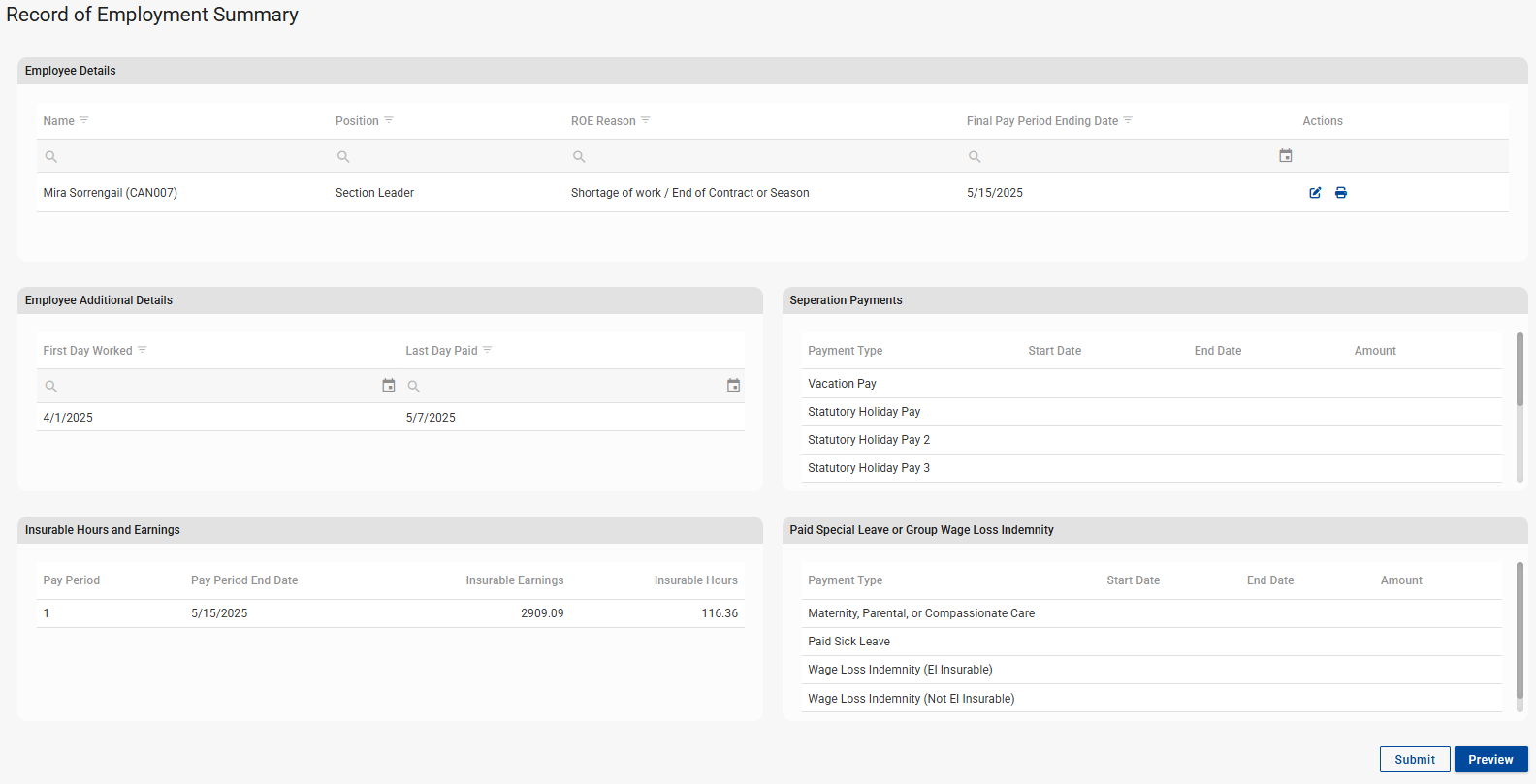 The information as captured on the employee’s ROE record displays on the employee's Record of Employment Summary screen.