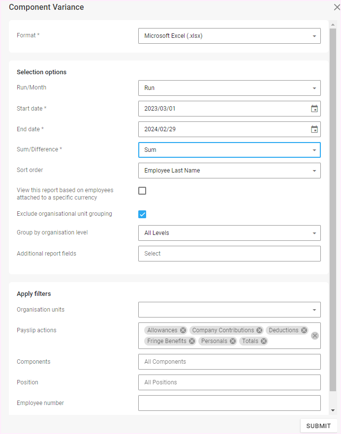 The figures on the Component Variance report may double if the Organisation Unit and the company name for which you generate the report are selected as a filter. To resolve the issue, ensure that you select either the Org Unit or Company Name option ...