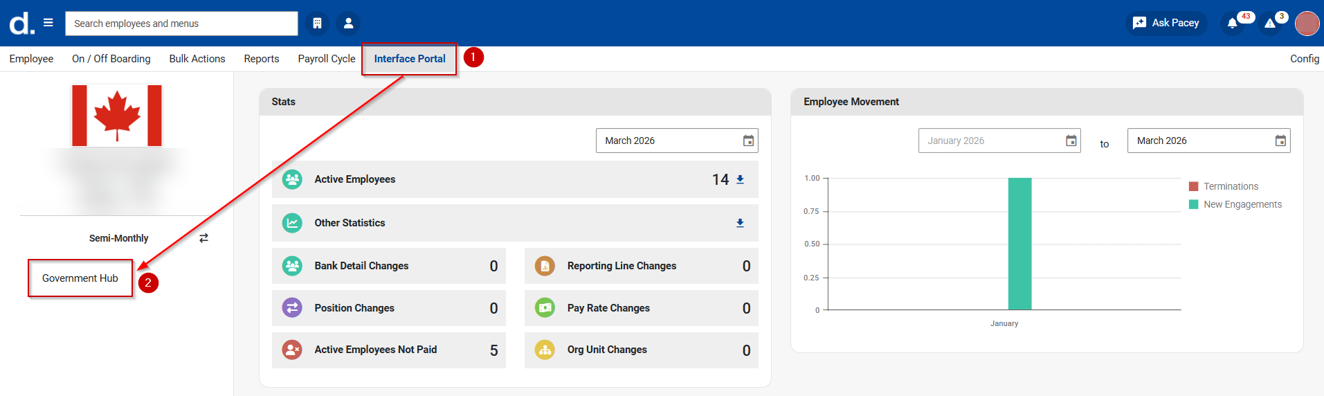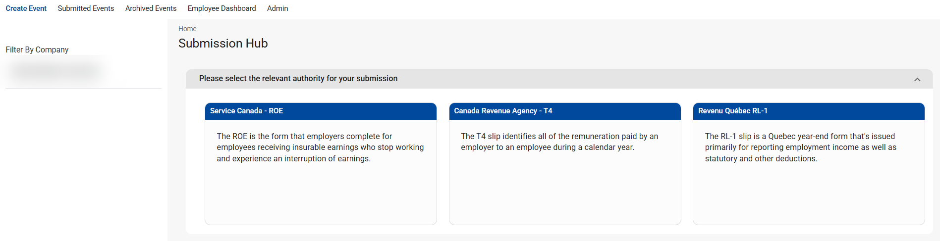 The Government Hub screen is the central portal for submitting payroll-related files to Canadian government agencies. From this screen, you can manage and submit filings directly to: