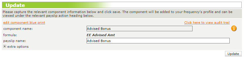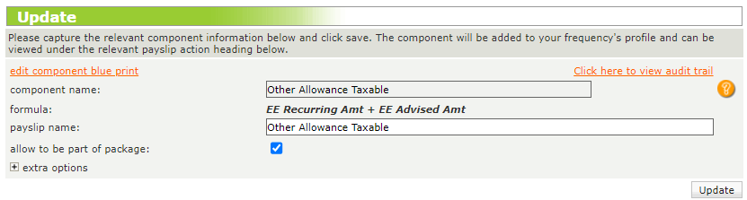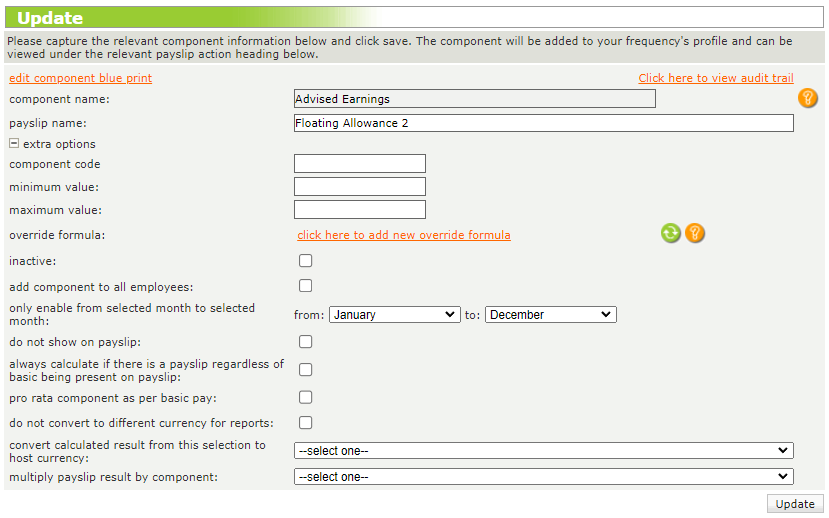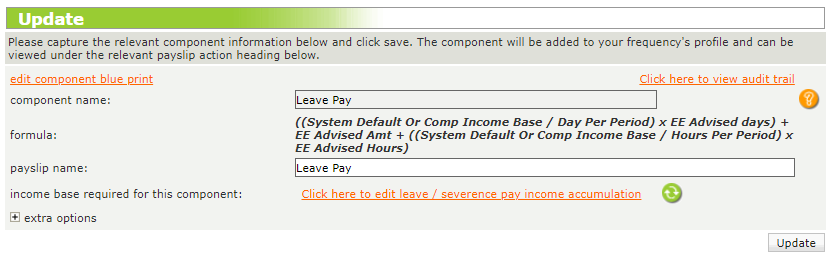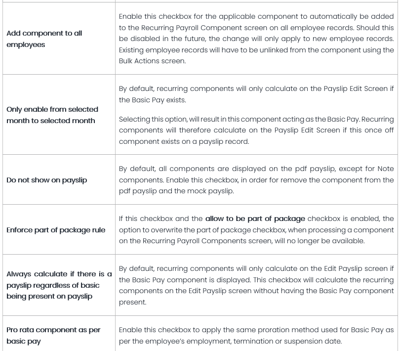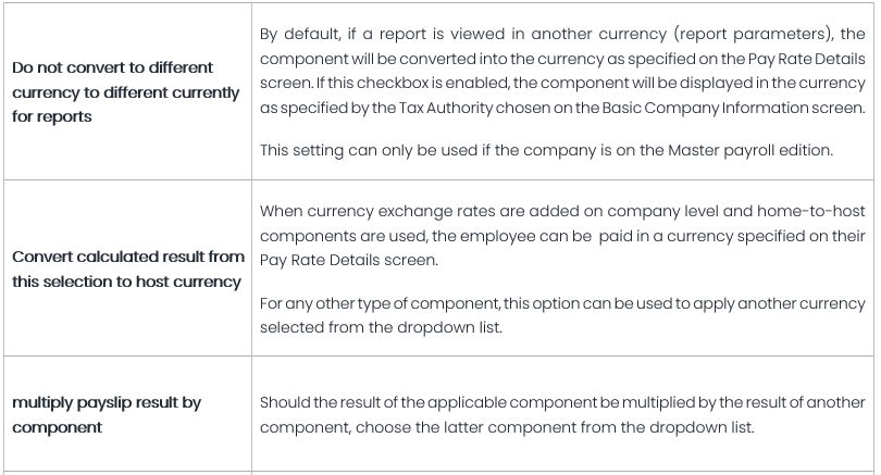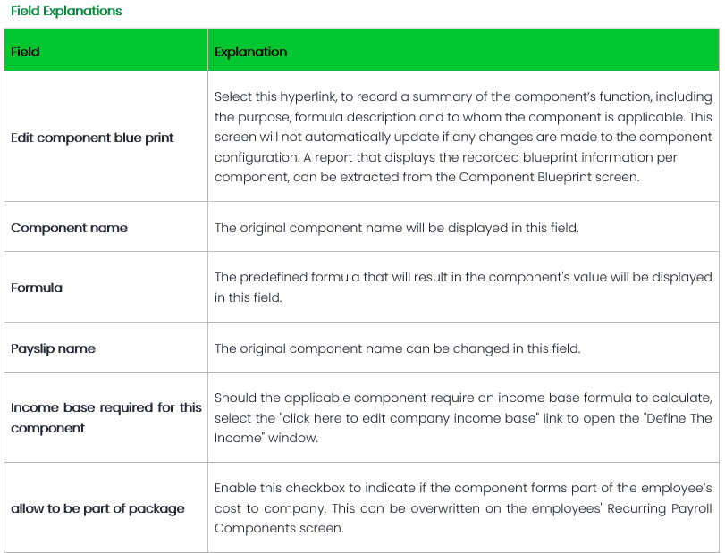 Depending on the type of component used, the landing page will allow users to view its original name, formula and change its name displayed on the Edit Payslip screen, as well as its income base.