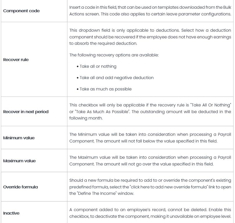 This feature is available on all PaySpace editions A component that was added to an employee’s record, can never be deleted. When editing enable the "inactive" checkbox to deactivate it, thus making it unavailable on employee level. Navigate > ...