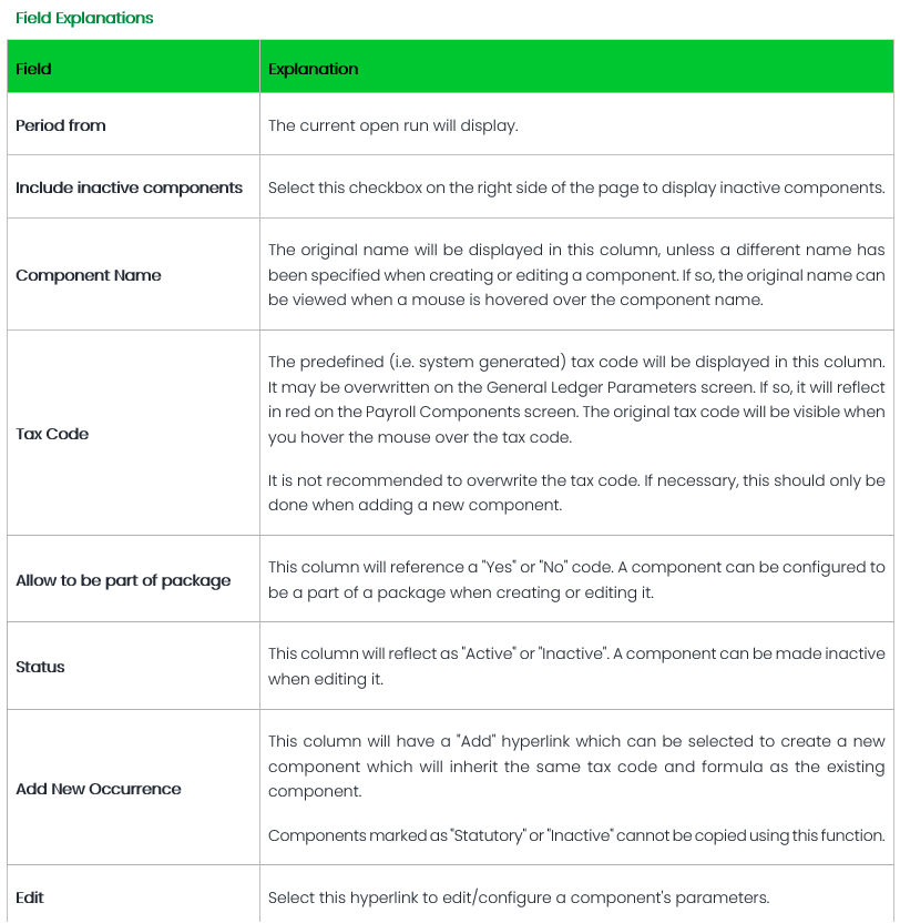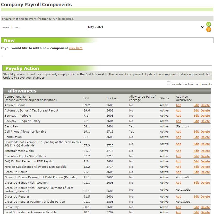 The Company Payroll Components screen stores a library of payslip actions a company requires on employee level. This includes automatic components (that will automatically populate/calculate on the Edit Payslip screen every period), and recurring and once-off components.
