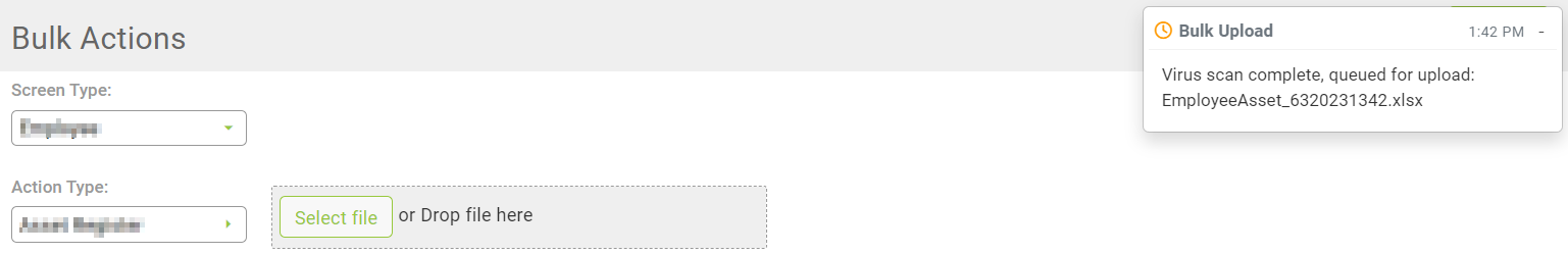 The Bulk Actions screen has been enhanced to perform a virus scan before a populated spreadsheet is uploaded. When selecting to upload a populated template on the bulk action screen the file will now be scanned for any viruses before being uploaded.