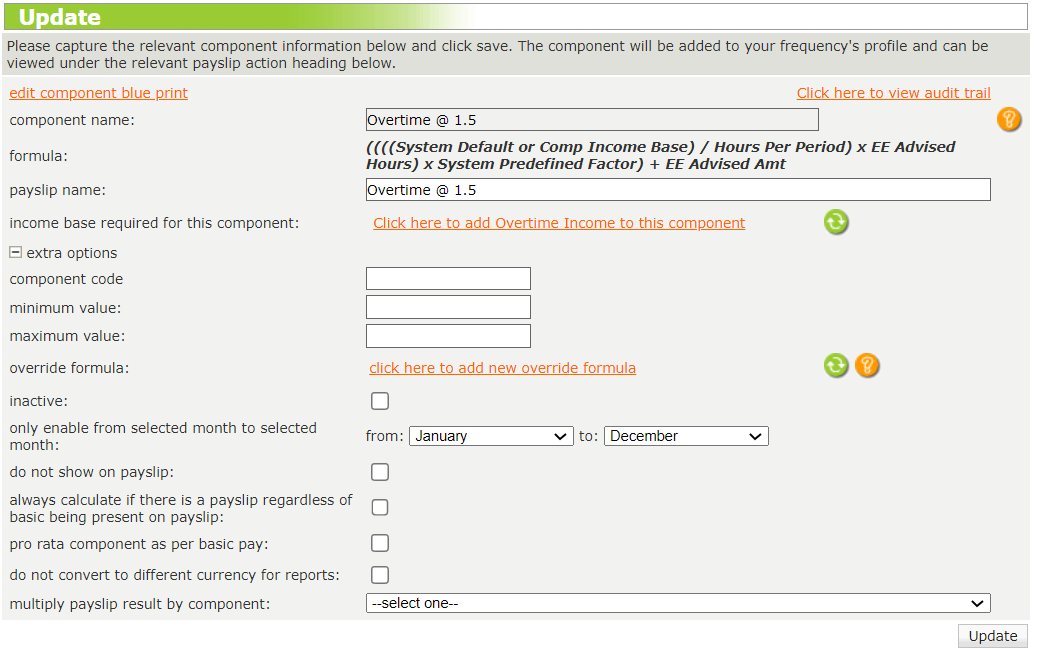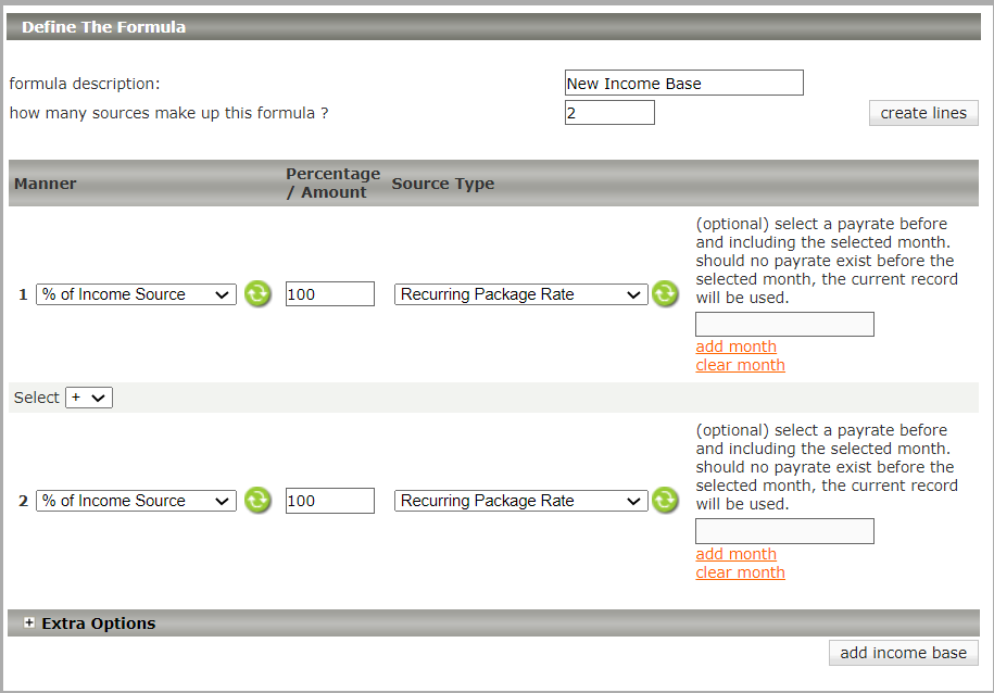 The "override formula" link allows for multiple instances of the same base component with each component following a specific income base setup.