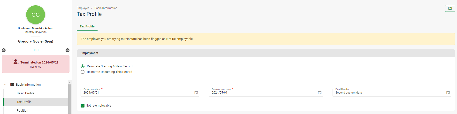 This feature is available on all Deel Local Payroll powered by payspace payroll editions When an employee is reinstated starting a new record, the system will create a new record on the History grid on the Tax Profile screen. Navigate > Employee > ...