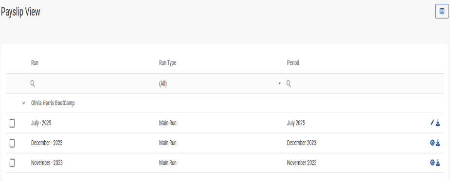 Once the employee has logged onto ESS, they will be able to view their payslip record from the Payslip View Screen. The employee will also be able to download or e-mail the PDF Payslip to themselves.