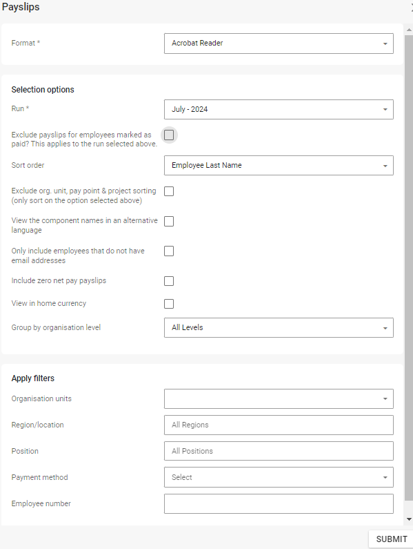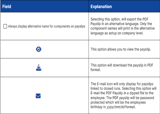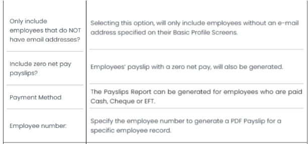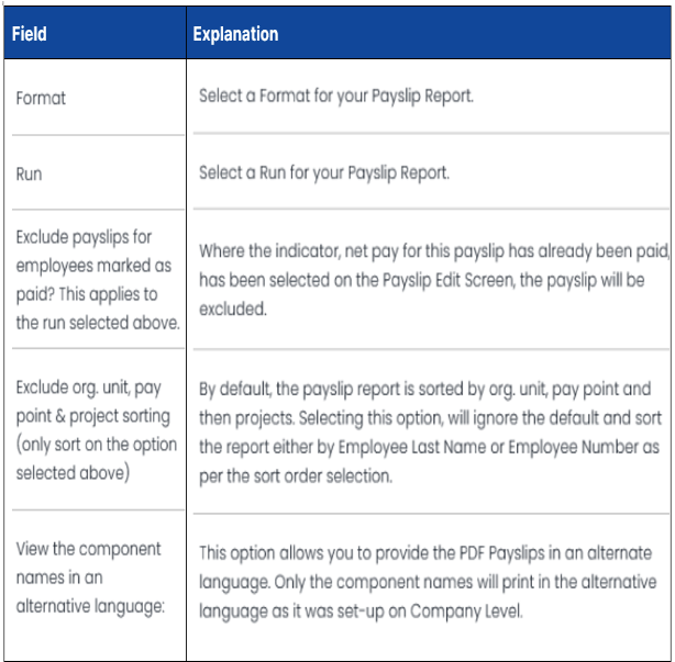 If Employee Self Service (ESS) is not used, the Payslips Report from the Reports Screen can be used to generate PDF Payslips.
