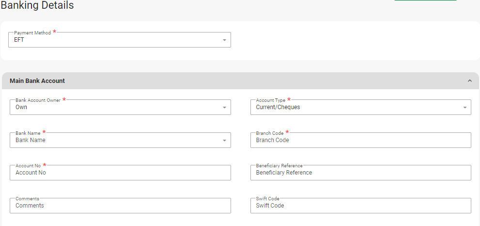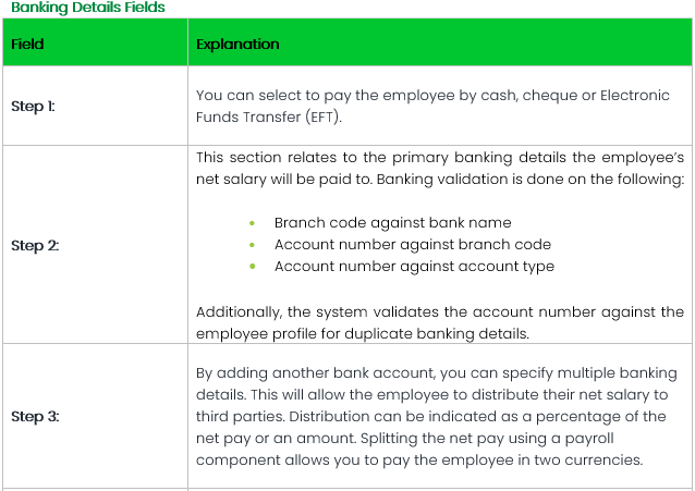 The Employee Bank Details Screen relates to the employee’s payment method and details required based on the payment method.