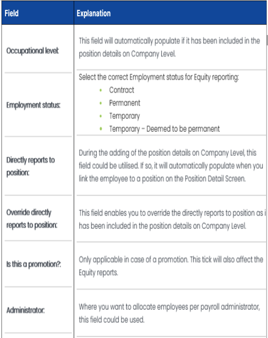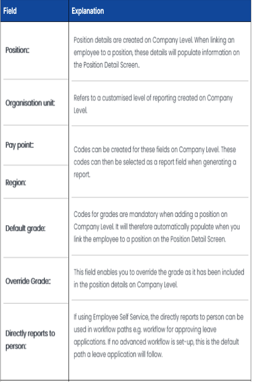 Overview The Position Detail Screen stores information pertaining to the employee’s position. This includes the employee’s organisation unit, the person they report to directly and occupational level, to name a few. A full history is available on the ...