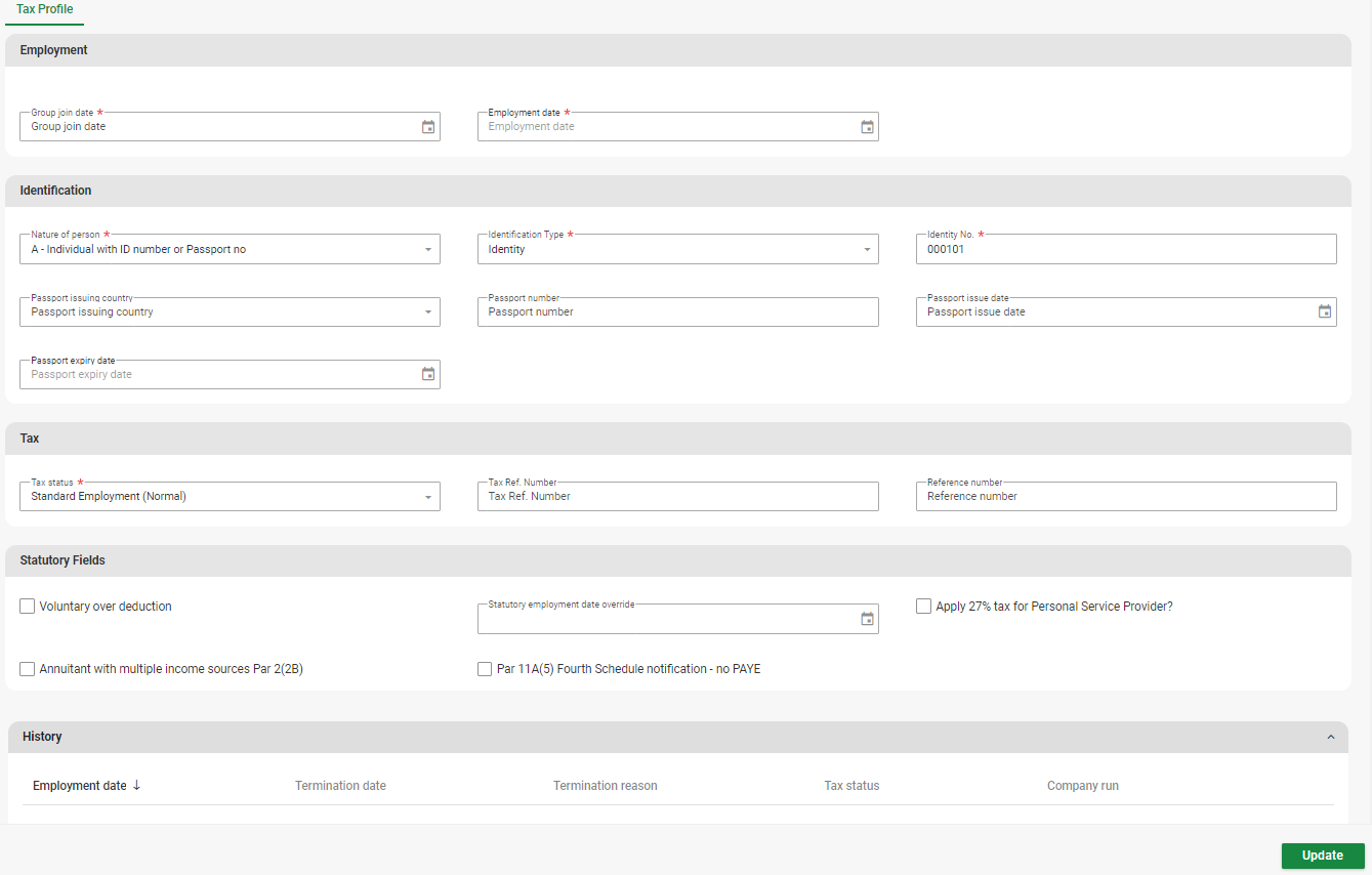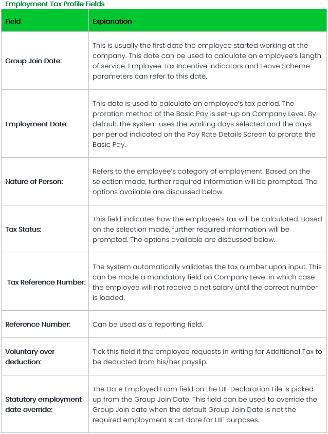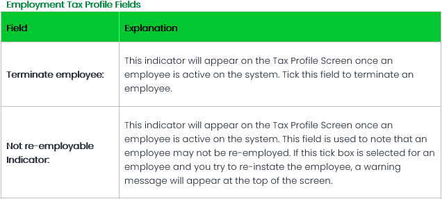 The Employee Tax Profile Screen stores information relating to the employee’s tax calculation. A history of tax records will accumulate at the bottom of the Employee Tax Profile Screen, should an employee be terminated and re-instated starting a new tax record.