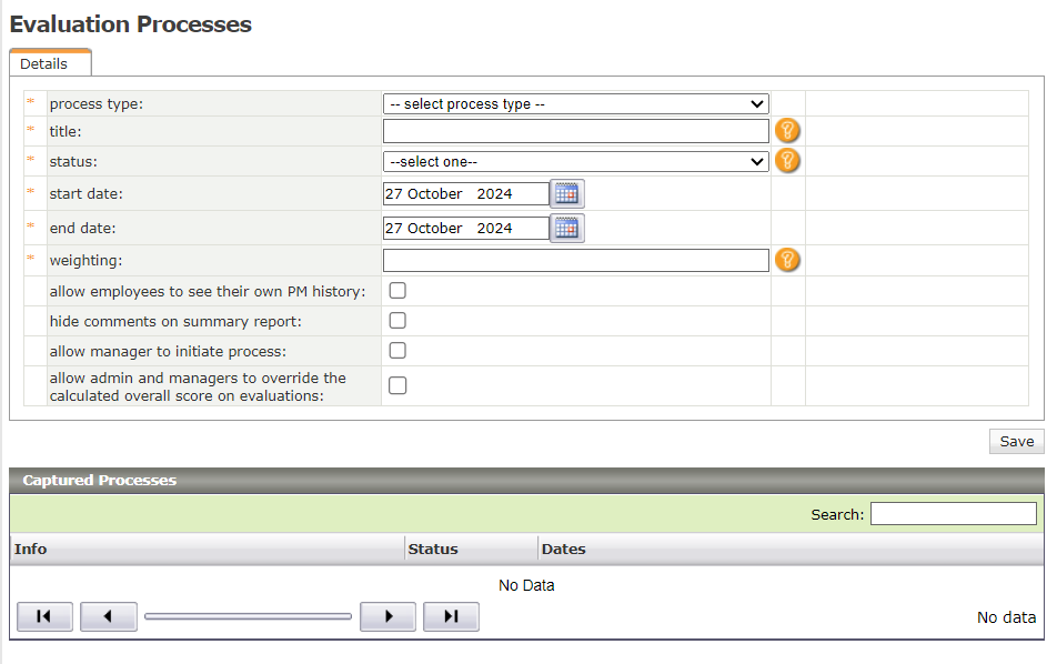 process type: Type of evaluation process. You must select a process type that exists in the system.