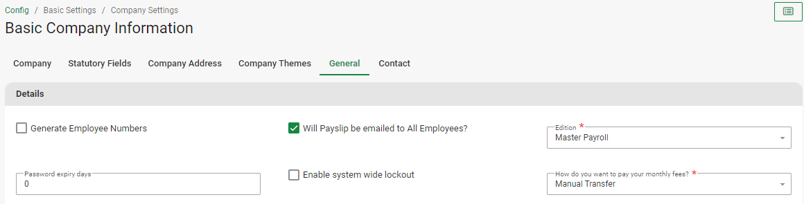 Navigate > Config > Basic Settings > Company Settings > Basic Company Information > General tab