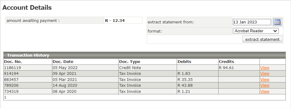 Transaction history will display for every month the company has been registered on the system. All fees payable for companies and frequencies registered on your profile will reflect in one invoice.