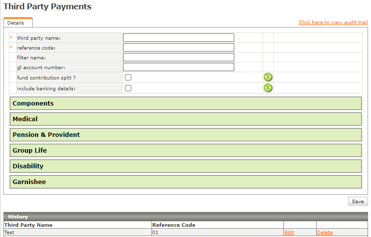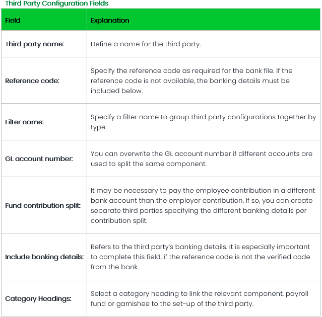 You can select any component, garnishee or payroll fund to create third party payments for. The third party payment can be set-up on the Third Party Payments Configuration Screen.