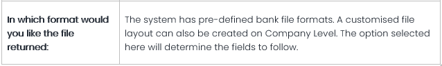 FNB eWallet payments can be configured and processed on PaySpace. Step 1: Create a custom bank file for the eWallet payments. Navigate > Configuration > Financial > Financial > Bank File Definition Utility Select the "Create a new bank file ...