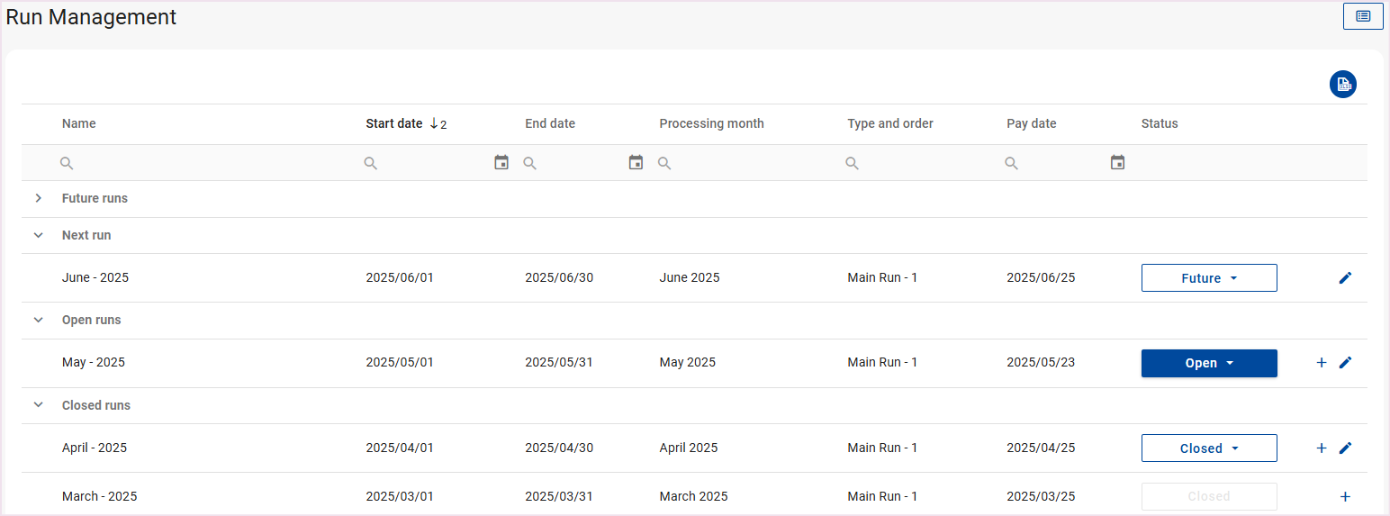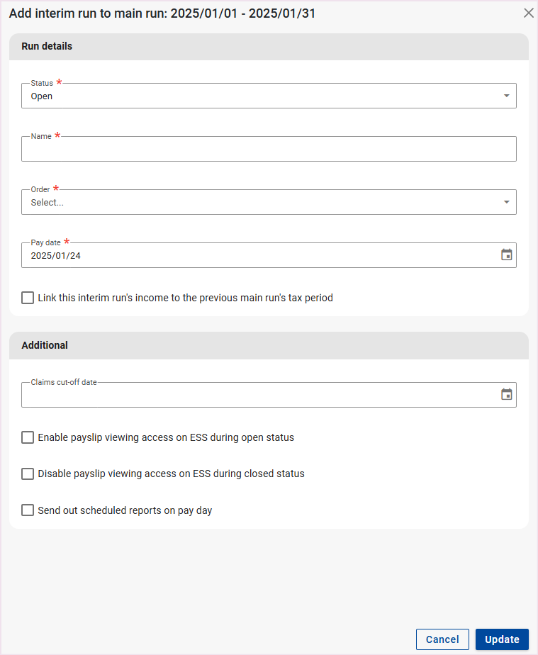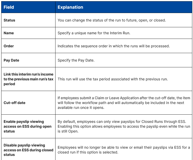 Interim runs enable you to create additional runs within the same processing period. Interim runs are created on the Run Management Screen.