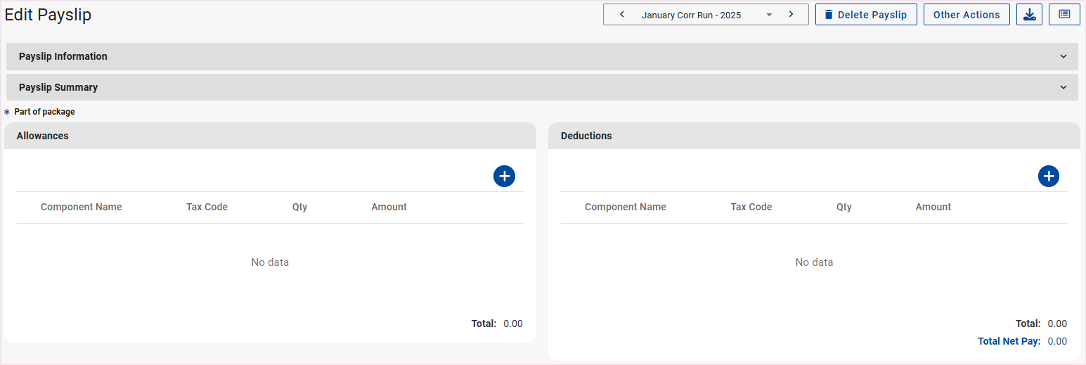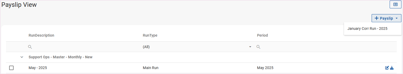 A payslip record for the relevant employees can be created from the Edit Payslip Screen.