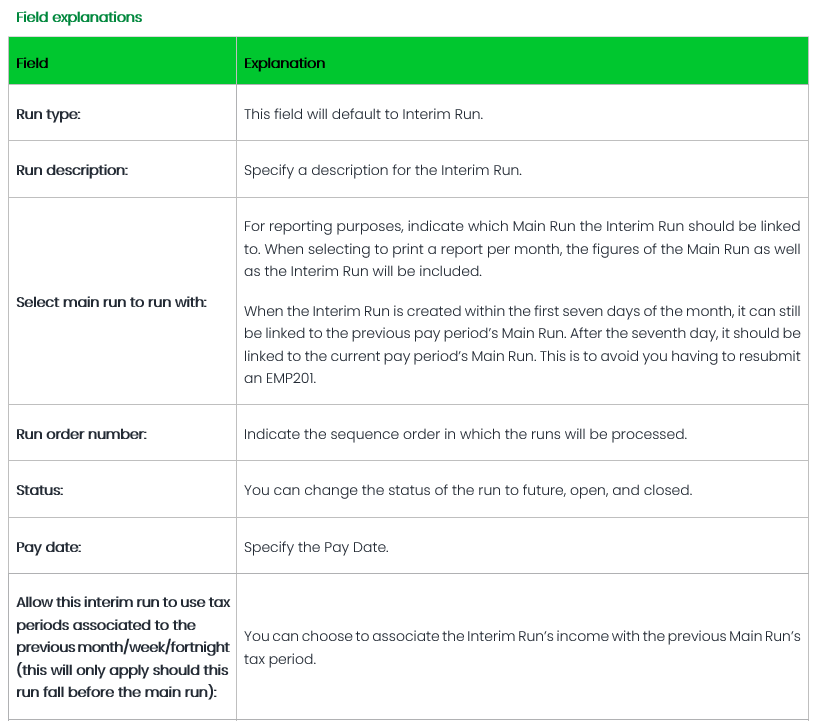 Interim runs enable you to create additional runs within the same processing period.  Interim runs are created from the Company Payslip Pay Dates Screen.