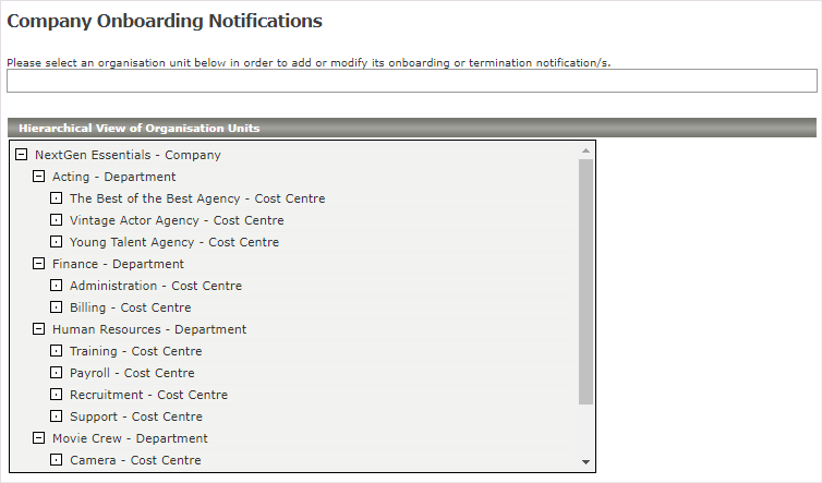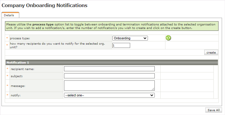 Select an Organisational Unit and complete the fields on the Company Onboarding/ Offboarding Notifications Screen: