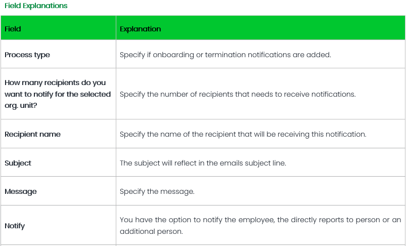 This feature is available on Premier and Master editions Customers can set up termination notifications for a specific organisation unit, triggering automated emails to designated recipients whenever an employee leaves the company. The notification ...
