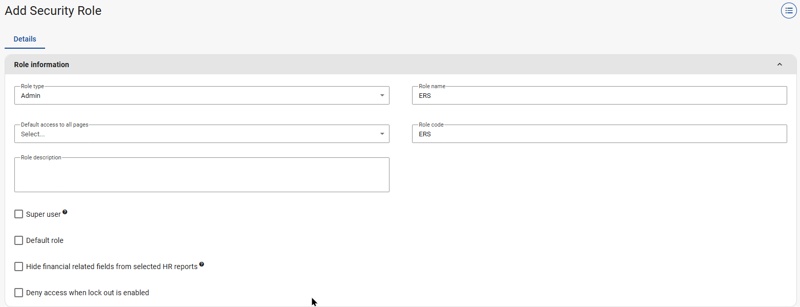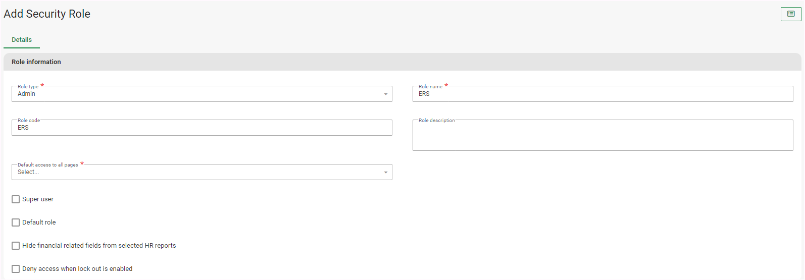 The user who needs to approve the timesheet input must be attached to a Security Role with a Role Code specified as ERS. The Role Code can be updated in an existing Security Role. Alternatively, a new Security Role can be created and assigned to the relevant user. If more than one user is attached to a Security Role, the Inbox entry will be assigned to all users in the role. Only one user needs to approve the Inbox entry.