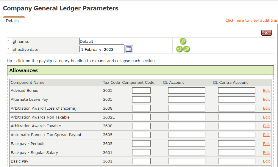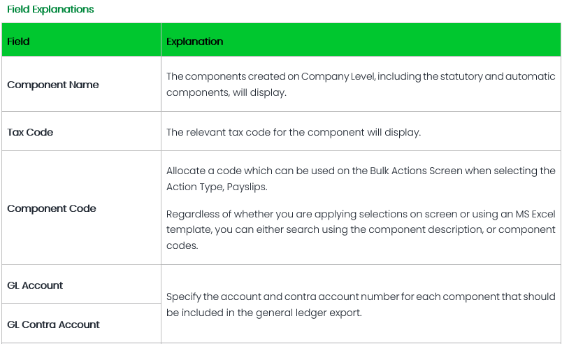 This feature is available on all PaySpace editions. The GL Account and GL Contra Account codes (numbers) can be added and edited per component on the General Ledger Parameters screen. Edit the applicable GL Account and GL Contra Account codes listed ...