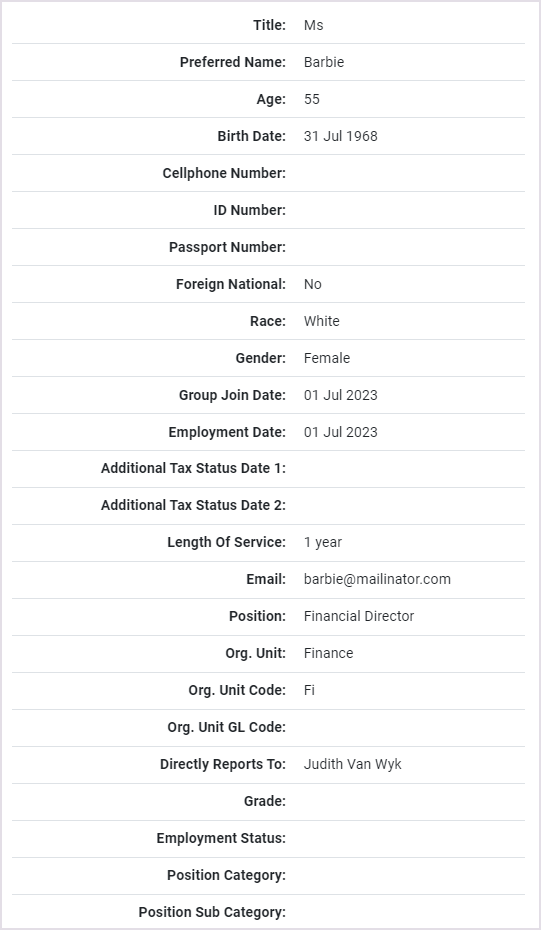 Once you have selected an employee’s record, you will be directed to the employee’s Public Profile. The Public Profile displays general information regarding the employee, for example contact details, position, organisational unit, peers and manager, to name a few.