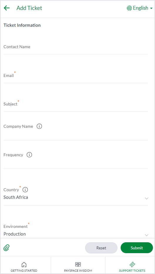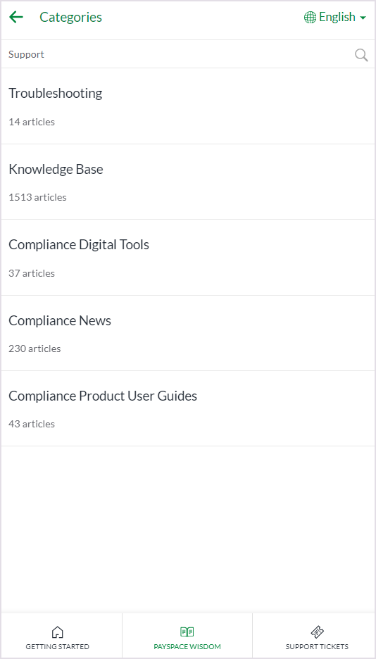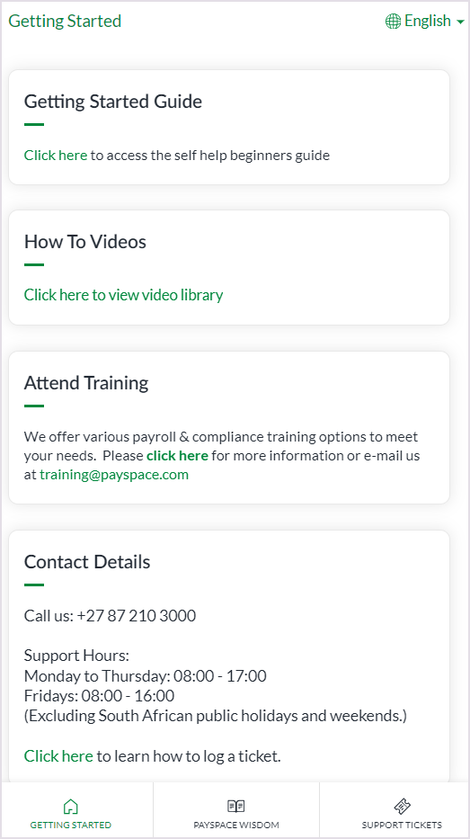 Provides you with access to PaySpace Getting Started Guide, How to videos, our training and support departments contact details and provides you with information on how to log a ticket. This menu option also gives you access to PaySpace Wisdom which provides access to our Knowledge Base, and Support tickets, which allows you to log a Support ticket directly from the system.