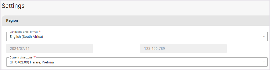 - Region: Select the language and format which will affect the language and date format on the system. The time zone selected, will be used when audit trail activities are recorded.