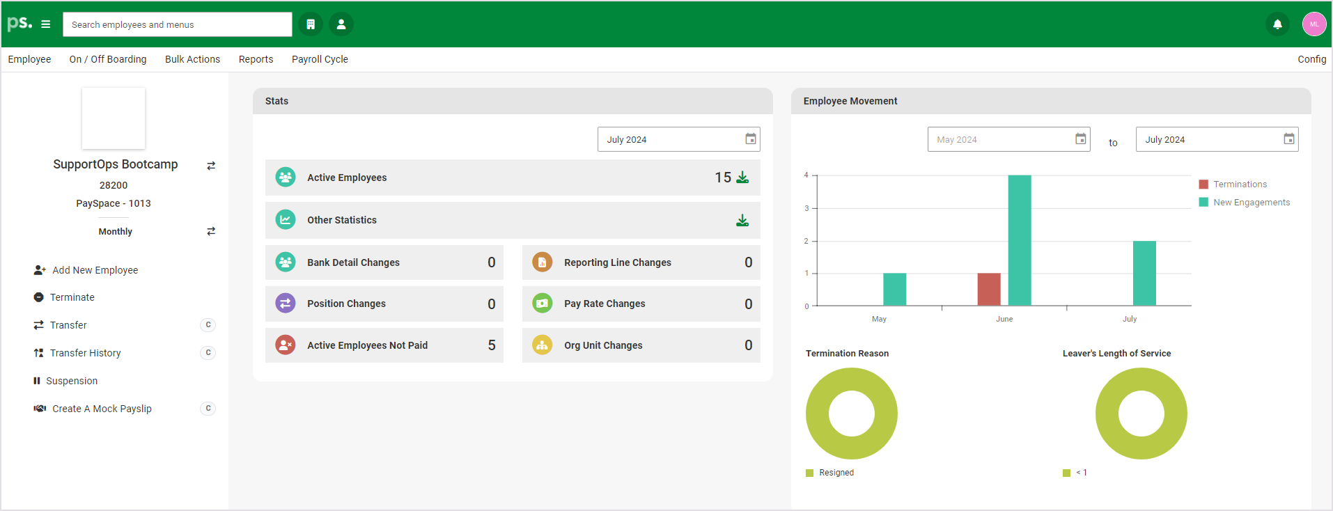 The Company Dashboard provides real time payroll information, for example, the top ten payroll variances, active employees not paid, employment movement highlighting engagements and terminations across a three-month period, trend analysis on staff turnover, to name a few. From any screen on the system, select the PaySpace logo from the Title Bar to navigate to the Company Dashboard.