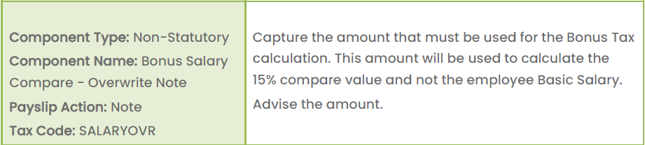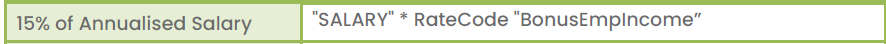 In scenarios the 15% compare may vary to the expected amount which could result in the Bonus Tax being compared to a different value , and flexibility does allow for users to add a note component to that should instead be used for the Bonus tax calculation.